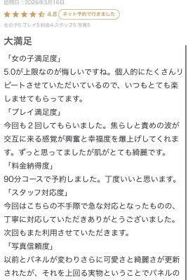 口コミお礼💌 2026/03/20 14:16:13 素敵な口コミありがとう😊💖今回もたくさん褒めてもらえて嬉しいし、楽しい🥺今回は焦らし多めの2回戦✨仲良しすぎて居心地がいい☺️今回もほんとありがとう😭